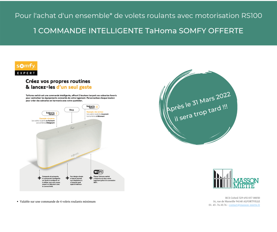 Masson Miette, située à Alfortville dans le Val-de-Marne (94), est experte en domotique SOMFY. Nous mettons à votre disposition un système qui vous permet d’avoir une maison connectée simple d’utilisation, accessible et évolutive.